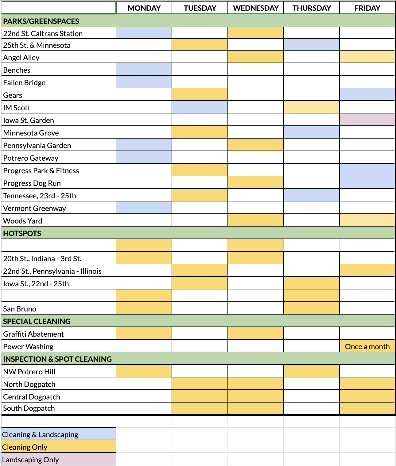 GBD Maintenance is provided by the landscaping company, Lainez, Inc. and the janitorial company Aim To Please. Both companies are in the Green Benefit District every week. Their schedules and monthly reports are below.
